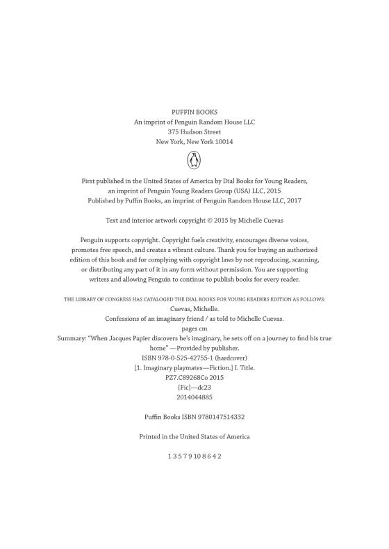 Jacques Papier has the sneaking suspicion that everyone except his sister Fleur hates him. Teachers ignore him when his hand is raised in class, he is never chosen for sports teams, and his parents often need to be reminded to set a place for him at the dinner table. But he is shocked when he finally learns the truth: He is Fleur's imaginary friend! When he convinces Fleur to set him free, he begins a surprising and touching, and always funny quest to find himself—to figure out who Jacques Papier truly is, and where he belongs.