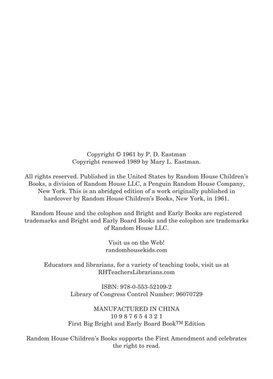P. D. EASTMAN wrote and/or illustrated many beloved children’s books, including Are You My Mother?, Go, Dog. Go!, and The Best Nest. After training at the National Academy of Design, P.D. worked at Walt Disney Productions and Warner Bros. Cartoons. He enlisted in the army in 1943 and served in the Signal Corps film unit, which was headed by Theodor Geisel (who would become known to the world as Dr. Seuss). Geisel later approached him to write for his new Beginner Books series at Random House, resulting in the publication of P.D.’ s first book, Sam and the Firefly.
