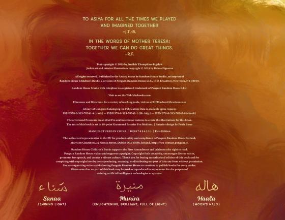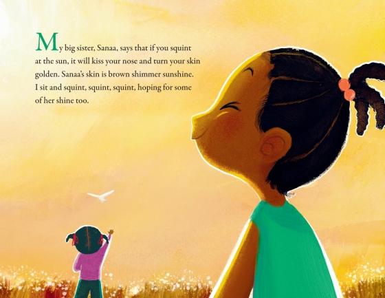 In this heartwarming celebration of sisterhood, three girls explore the natural world and discover the harmony of being the littlest, middle, and oldest sister.Haala, the middle sister, loves to follow along behind her older sister, Sanaa, on their outdoor adventures. But her little sister, Munira, always seems to get in the way. Munira blocks the sun’s kiss, interrupts the wind’s song, and scares away the goldfish’s secrets. Haala can’t keep up with Sanaa when Munira’s on her heels. But when the sisters take a moment to work as a team, they realize that together they can achieve anything--and that together they are sunshine.