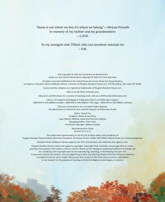 Newbery Honor and Children's Literature Legacy Award winner Carole Boston Weatherford and Coretta Scott King Illustrator Award winner Frank Morrison deliver a heartwarming peek at the love and the chaos that ensue when a family comes together and connects through food.
