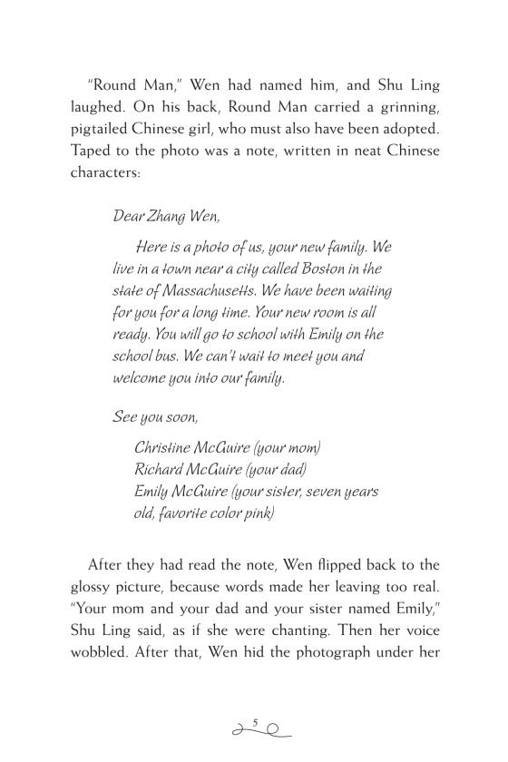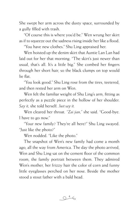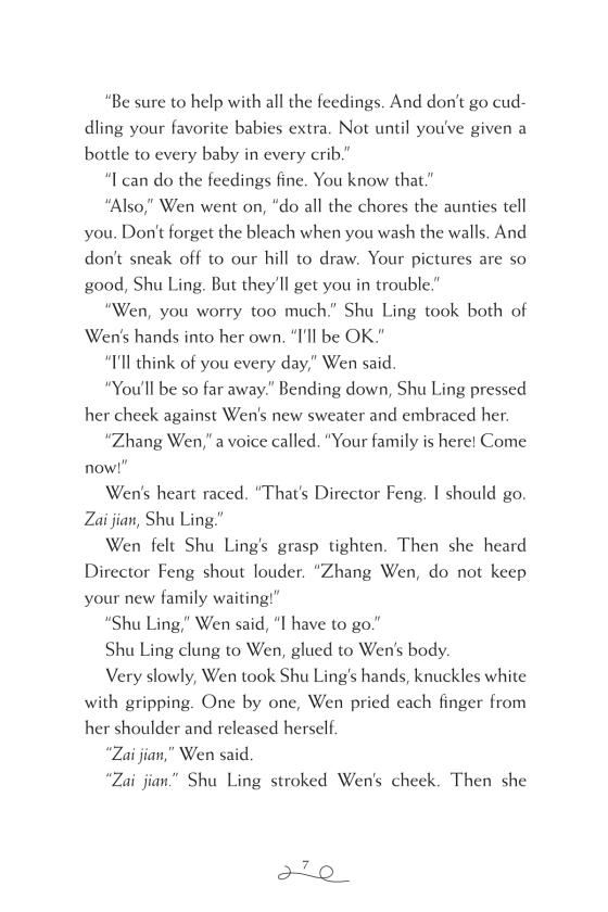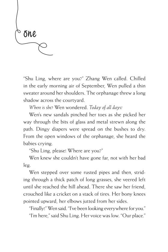When a girl is adopted from a Chinese orphanage, everything she knew about family, best friends, and sisterhood must change.Wen has spent the first eleven years of her life at an orphanage in rural China, and the only person she would call family is her best friend, Shu Ling. When Wen is adopted by an American couple, she struggles to adjust to every part of her new life: having access to all the food and clothes she could want, going to school, being someone's daughter. But the hardest part of all is knowing that Shu Ling remains back at the orphanage, alone. Wen knows that her best friend deserves a family and a future, too. But finding a home for Shu Ling isn't easy, and time is running out . . .