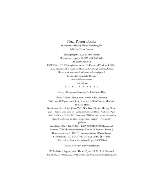 The tightly focused sentences move briskly in Thomas and Steele’s third wryly clever installment; developing readers will giggle while eagerly turning pages. The art again perfectly suits the droll, understated text as googly-eyed, squat kids and a desiccated, grumpy librarian join the crotchety but somehow cuddly Wolf. . . . Another can’t-miss outing with an irresistible, introverted antihero.